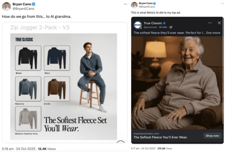 However, sometimes you can do everything by the book as a marketer and still get burned by the platform you display your ads on. Apparel brand True Classic discovered that Meta’s Advantage+ system had swapped its top-performing ad (a millennial guy in a fleece set) for a cheerful, clearly AI-generated granny sitting in an armchair (wearing a set, though – at least this part the system got right).